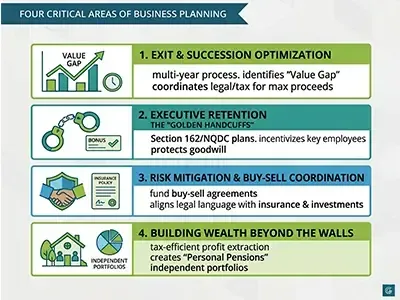 To satisfy the complexities of modern wealth, we focus on four critical areas of business planning. Each area is designed to protect your "One Degree of Separation" and ensure your business remains a blessing, not a burden, to the next generation.